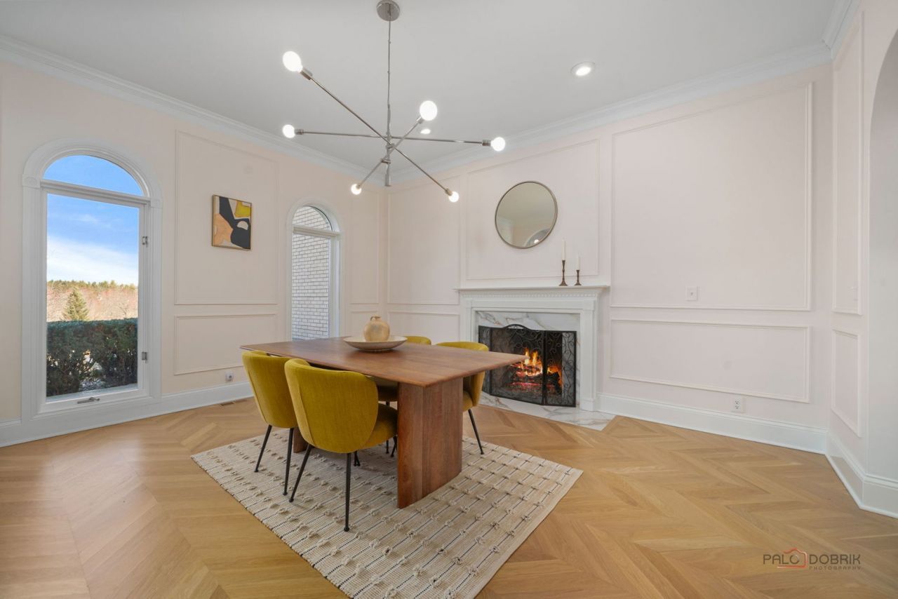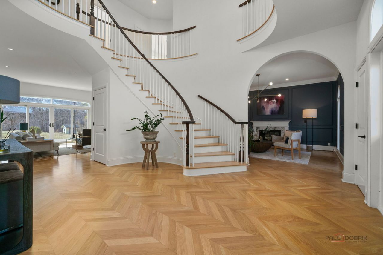 This elegant two-story brick residence offers approximately 6,800 square feet of refined living space and was comprehensively renovated in 2021. Set on 37.5 acres, the property is approached by a winding, tree-lined drive extending from a private gated entrance to the home. Three ponds enhance the picturesque setting and provide tranquil views throughout the grounds. Upon entry, a grand two-story foyer with a sweeping circular staircase creates a striking first impression. Oak flooring extends throughout both the first and second levels. Flanking the foyer, the formal living room features paneled walls, crown molding, and a marble-hearth, two-sided fireplace. Opposite, the dining room also showcases a marble fireplace and connects to the kitchen via a butler's pantry. The kitchen is both functional and well-appointed, featuring contemporary white and blue cabinetry, stainless steel appliances, and quartz countertops with a waterfall-edge island and matching backsplash. An octagonal breakfast room with arched windows surrounds the space with natural light. Adjacent to the kitchen, a spacious mudroom with built-in cabinetry leads to the laundry room and attached three-car garage. Through an arched opening, the family room offers expansive windows and a sliding glass door leading to a concrete aggregate patio overlooking the grounds. A private home office with a bay window is located just beyond. A notable feature on the main level is the children's playroom, situated next to a first-floor bedroom with an en-suite bath. This flexible space may serve as a primary suite, guest accommodations, or an in-law arrangement. The second level includes three additional bedrooms. The primary suite features a fireplace and private access to a catwalk leading to a balcony with views of the ponds. The catwalk continues to a secondary bedroom, ideal for use as a nursery. The primary bath is appointed with terrazzo tile flooring, a walk-in shower with a frameless glass enclosure, a walnut vanity with a granite countertop and dual vessel sinks, and a freestanding tub positioned beneath a window. The remaining bedrooms share a generously sized hall bath, complete with dual vanities, a walk-in shower with a frameless glass enclosure, and a freestanding tub. The lower level is thoughtfully divided into two distinct areas. One side is designed for recreation and entertaining, offering a large space suitable for a billiards room or home theater, along with French doors leading to a wine cellar with built-in storage. The opposite side features a private apartment with its own entrance, including a living room, kitchen, bedroom, office, bathroom, and laundry area. This space is well-suited for an in-law arrangement, guests, nanny suite, or potential rental use, with direct access to a covered carport beneath the main-level deck. There is a pole barn on the property, ideal for a workshop, vehicle storage, or potential equestrian use. An artist had a vision to make this home