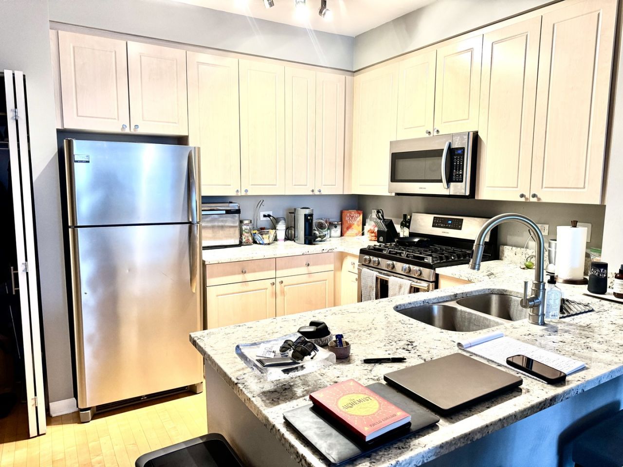 Prime location just steps from Fulton Market, River North, and the Loop. This spacious 1-bedroom, 1-bath residence features an open floor plan with stunning western exposure and great natural light, which can be enjoyed from the large private deck accessible from both the living room and bedroom. The home offers wide-plank hardwood flooring throughout and an updated kitchen with a center island, granite countertops, and stainless steel appliances-ideal for both everyday living and entertaining. The bedroom includes a large walk-in closet, and the unit is complete with an in-unit washer and dryer. Full-amenity building with 24-hour door staff, fitness center, party room, dry cleaners, and additional storage. Garage parking and storage included. Enjoy everything Fulton Market has to offer just outside your door- East Bank Club is steps away, renowned restaurants, nightlife, boutique fitness, coffee shops, and easy access to public transportation, expressways, and downtown.