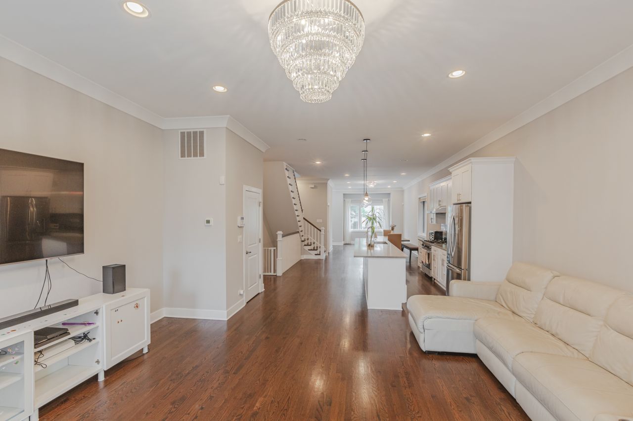Rarely available 56' long home with all masonry construction. 10' high ceiling throughout 1st floor with contemporary style crown molding and extra tall baseboard. The open floor plan on the 1st floor offers a seamless flow from living to the formal dining space with stylish lighting fixtures. Hardwood floor throughout 1st and 2nd floor. The gourmet kitchen features a huge 12' long eat-in island with upgraded quartz countertop and a high-end 36 commercial grade stove. 3 spacious bedrooms on the 2nd floor with 2 skylights in the hallway and 1 skylight in the master bath. Laundry hook-up available on the 2nd floor and in a full-size laundry room in the basement. Every bedroom has a walk-in closet for ample storage. Wide-open REC room in basement with high ceiling and luxe carpeting for added comfort! The basement has a 4th bedroom and 1 full bath with exterior access connected to the freshly painted deck in the backyard.