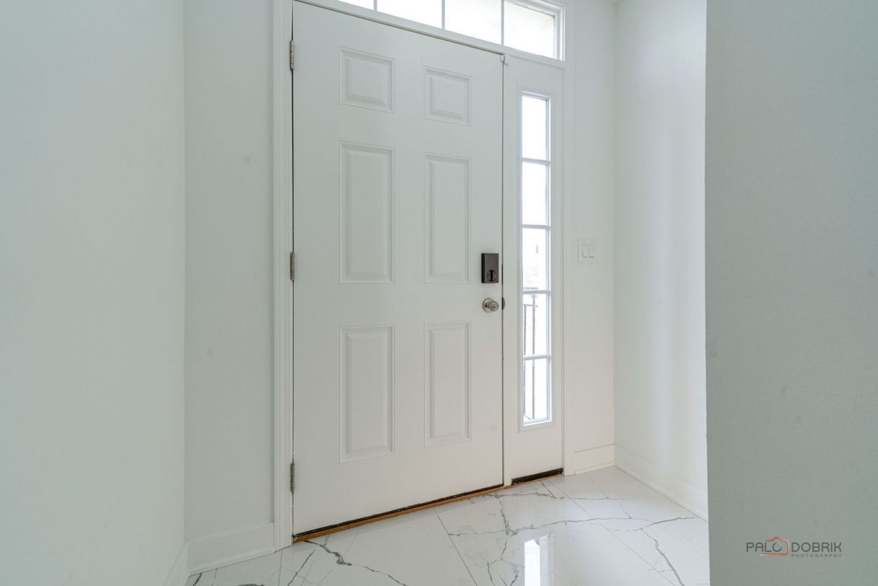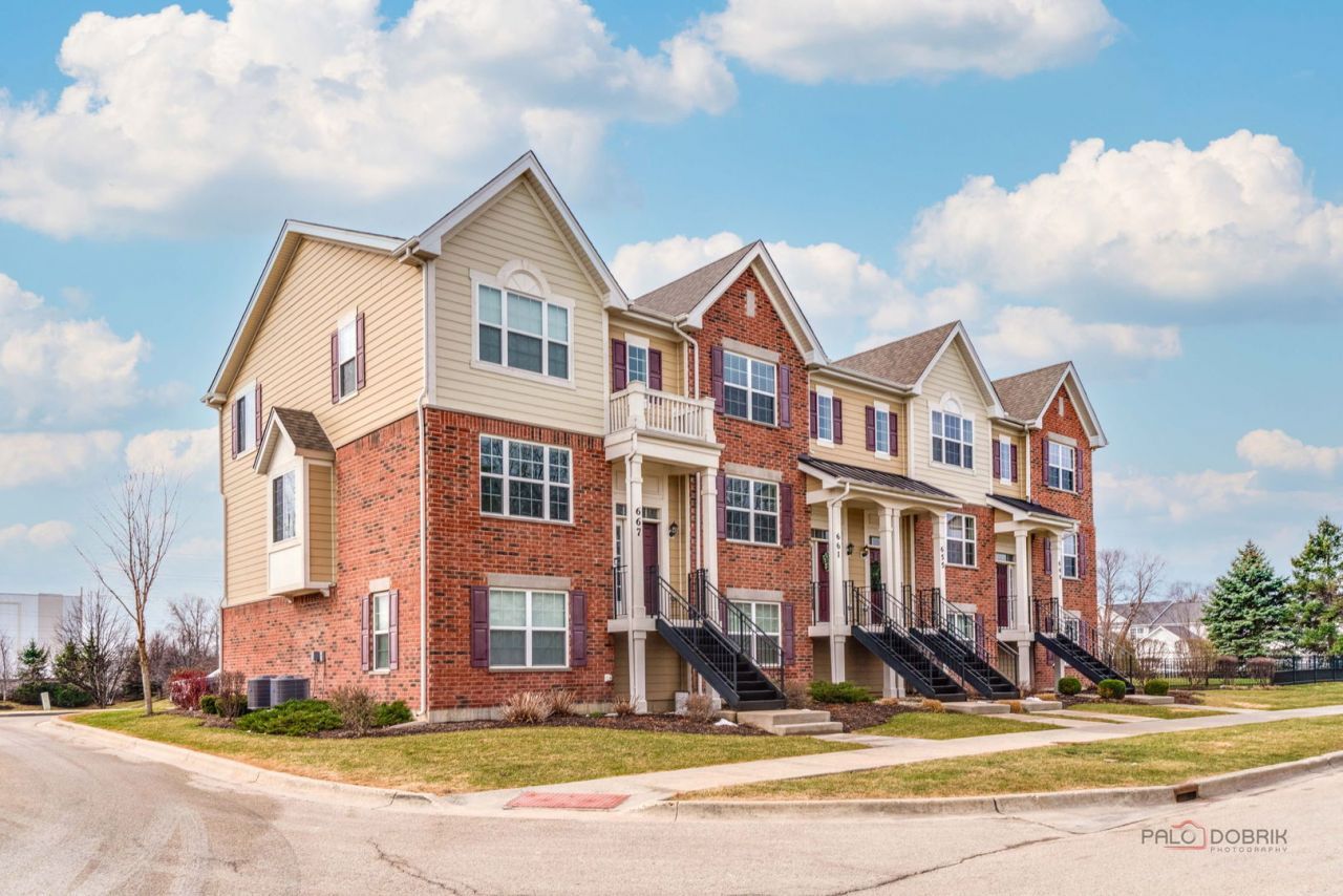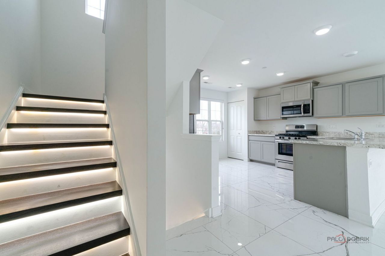 This stunning three-bedroom, two-and-a-half-bathroom, three-story, end-unit townhome in the desirable Lake Ridge Townhome subdivision of Mundelein offers a sleek, contemporary design throughout. The main level features an open-concept layout highlighted by a modern kitchen with gray Shaker cabinetry, stainless steel appliances, and a breakfast bar overlooking the dining area. The dining room flows seamlessly into the living room, creating an ideal space for both everyday living and entertaining. Gleaming, heated tile flooring enhances the home's clean, contemporary aesthetic. A sliding glass door off the living room leads to a private deck with pond views. Upstairs, you are welcomed by illuminated stair treads and hardwood flooring throughout the bedroom level. The spacious primary suite includes a walk-in closet and an ensuite bathroom with gray Shaker cabinetry and a walk-in shower with clear glass doors. Two additional bedrooms, a full hall bathroom, and a convenient laundry closet with a front-load washer and dryer complete this level. The lower level offers a versatile space, perfect for a home office, featuring built-in shelving. The attached two-car garage includes an electric vehicle charger. Ideally located near restaurants and shopping, this property is available for immediate occupancy with a one-year lease.