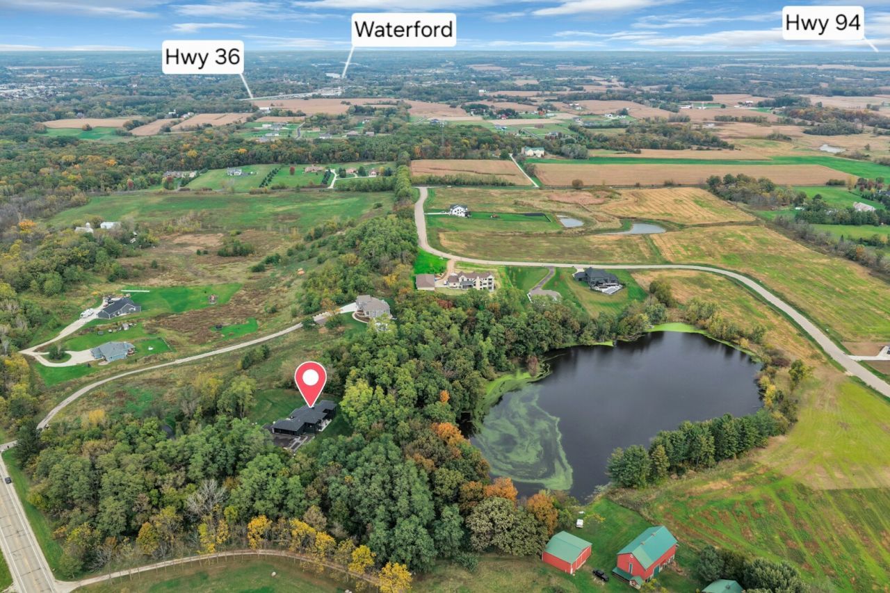 Luxurious Award Winning Home 2024 set on 4.58 private, wooded acres with tranquil lake views, this modern estate blends architectural sophistication with everyday livability. Thoughtfully designed and impeccably built, the home balances elegance, comfort, and advanced technology in a serene setting. Sun-filled living spaces showcase clean lines, refined finishes, and expansive views. The chef's kitchen features premium JennAir appliances, quartz countertops, custom cabinetry, and a built-in Miele espresso machine, ideal for entertaining. A sunroom offers retreat. The primary suite includes a spa-inspired bath with heated floors. The walk-out lower level features fitness and wellness areas. Additional highlights include smart-home integration, security cameras, and a whole-home generator. Enjoy privacy with access to I-94.